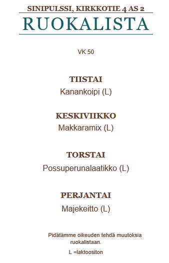 Lounas tarjolla klo 11-12.30 ti-pe. Ruokaan kuuluu päivittäin pääruoka ja lisäkkeet, salaatti, leipä, jälkiruoka sekä kahvi/tee. Hinta 4 € (työssäkäyvät 6 €).