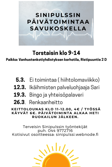 HOX SAVUKOSKI! Ikäihmisten palveluohjaaja Sarin vierailu siirtyy pidettäväksi torstaille 19.2. Torstaina 12.2. on renkaanheittoa korvaavana toimintana.